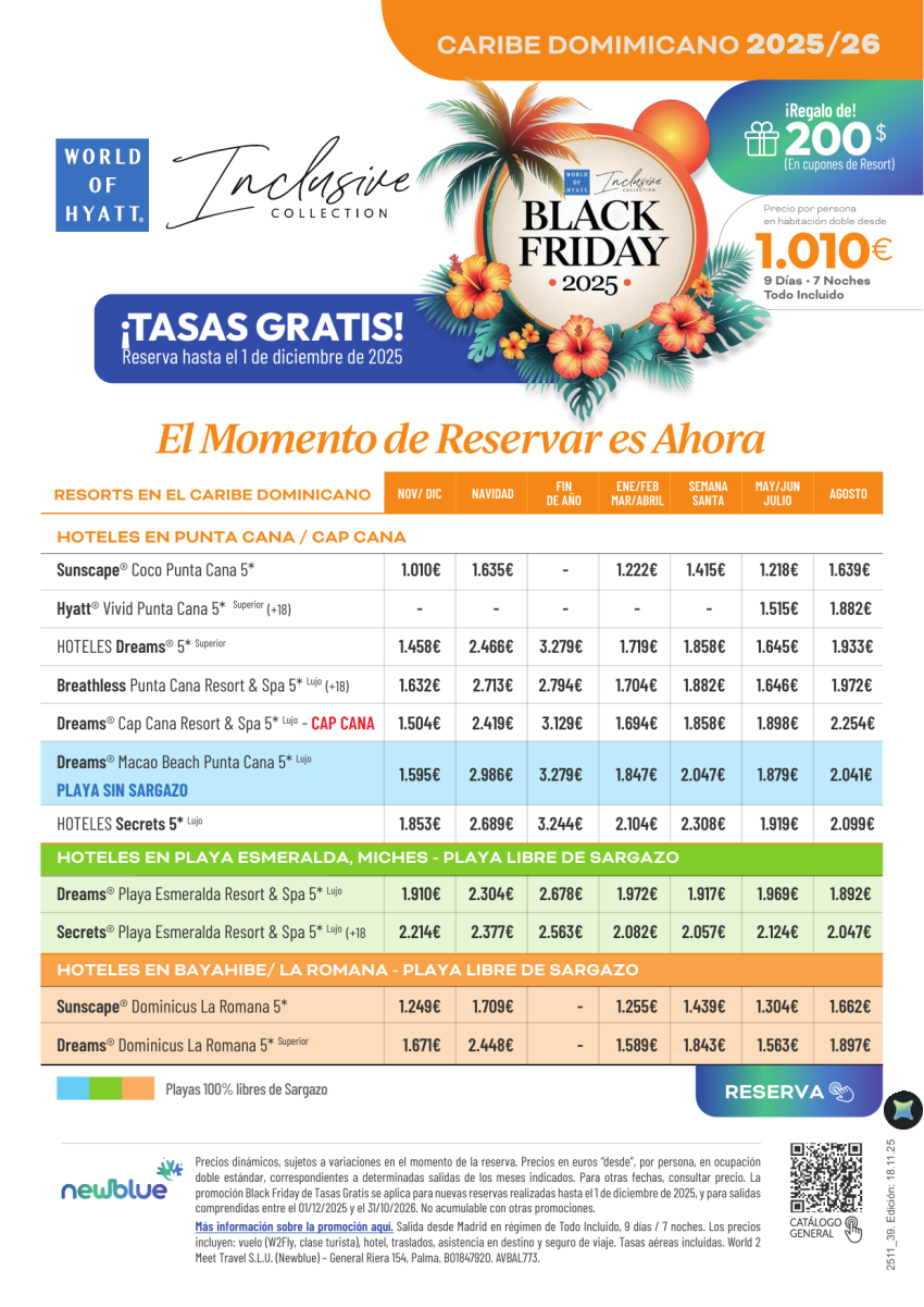 ¡Tasas Gratis! Black Friday Caribe Dominicano. Reserva hasta el 1 Dic con Newblue y Hyatt Inclusive Collection